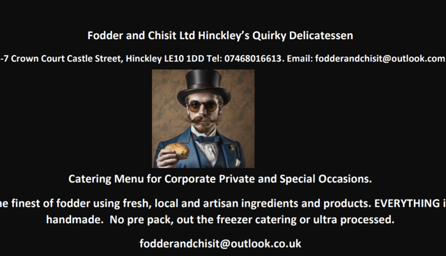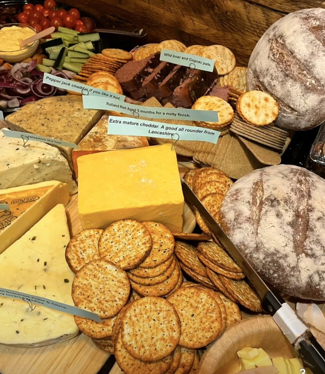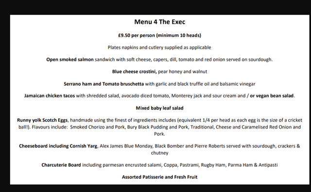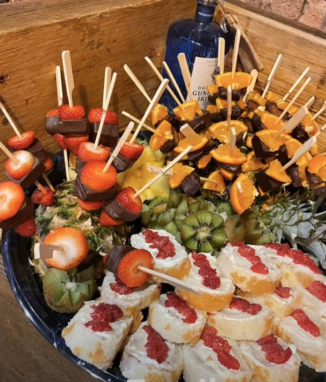 Open smoked salmon sandwich, Blue cheese crostini, Serrano ham and Tomato bruschetta. Jamaican chicken tacos with shredded salad, avocado diced tomato, Monterey jack and sour cream and / or vegan bean salad. Mixed baby leaf salad. Runny yolk Scotch Eggs. Cheeseboard. Charcuterie. Assorted Patisserie and Fresh Fruit