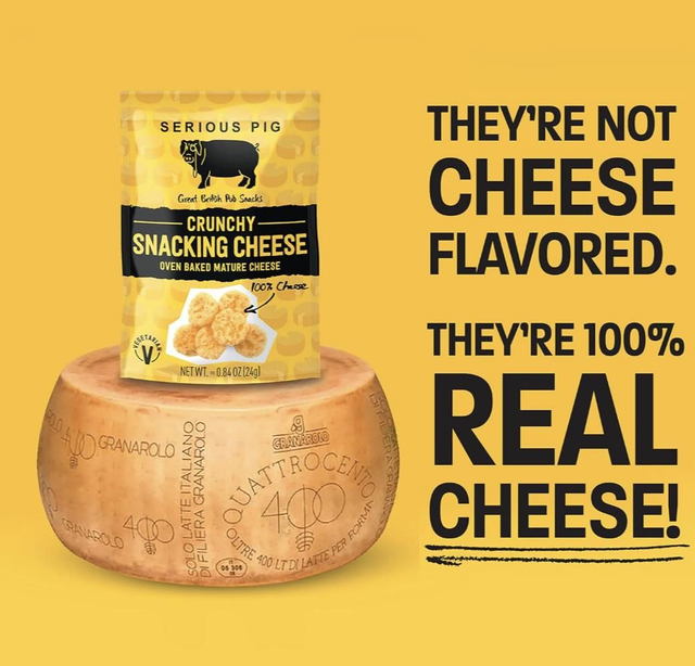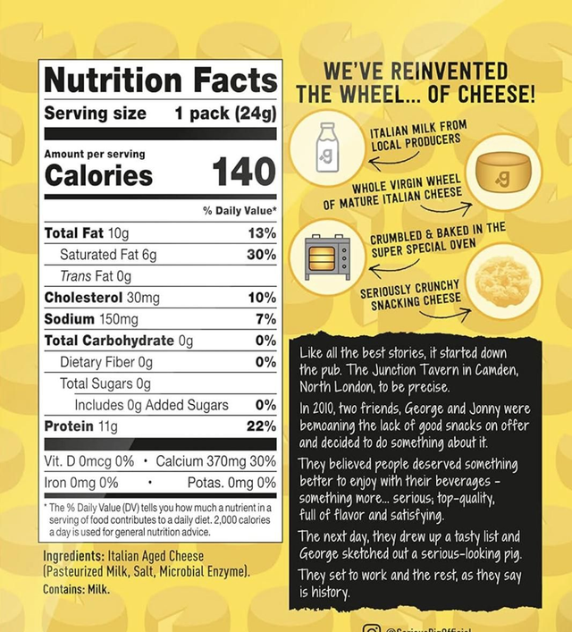 If you’ve yet to try it, then we can safely say you’ve not had anything like it before. It’s not a cheese cracker nor cheese flavoured crisp, it’s cheese reinvented. It’s 100% mature Italian hard cheese baked in a super special oven, a process which heralds an evolutionary leap for cheese! It’s liberated from the fridge, can be safely delivered by post and offers an entirely new crunchy cheese experience. Pub snacks, bar snacks, crisps, cheese snacks, veggie snacks, keto snacks, low carb, high protein. Made in United Kingdom • Ingredients: Milk, salt, vegetarian rennet.